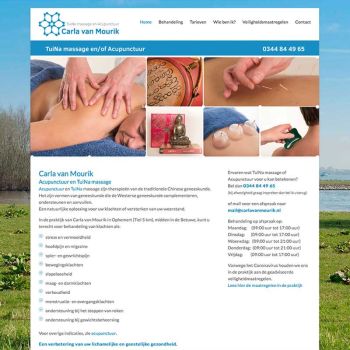 Voor Carla van Mourik ontwierpen we haar logo en website. Bij het ontwerpen van het logo hadden we voor ogen dat er punten in het ontwerp moesten zitten die aanraking verbeelden. Bovendien voelde we dat er rondingen in het ontwerp moesten zitten. Er is gekozen voor de kleur blauw omgeven met veel wit vanwege de frisse uitstraling hetgeen past bij Carla van Mourik. Voor de openingspagina van haar website hebben we gekozen om alle behandelingen direct in beeld te brengen.