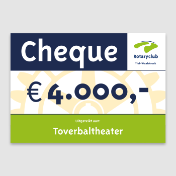 Voor de Rotary hebben wij vier cheques gemaakt die zij hebben uitgereikt, waaronder deze voor het Toverbaltheater.